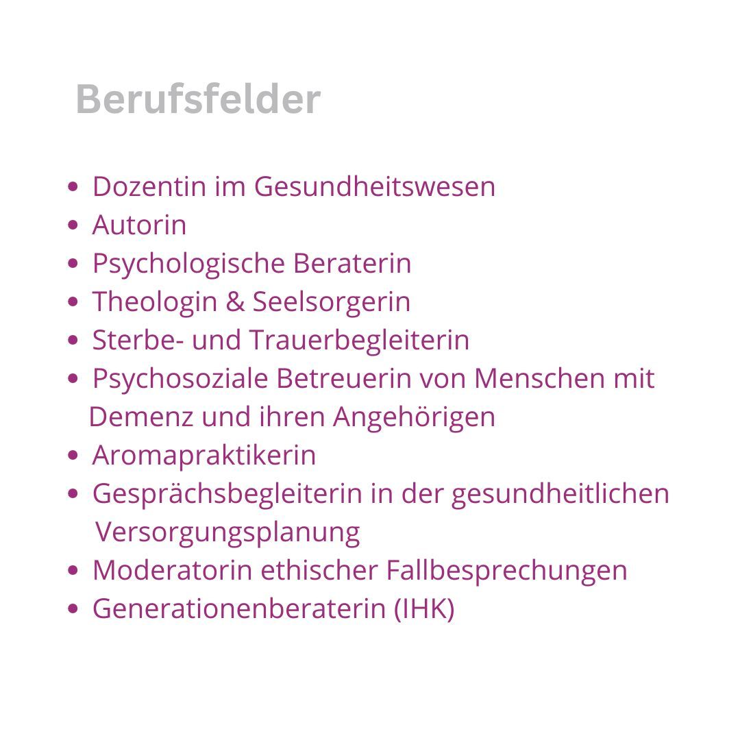- 10 Jahre Erfahrung im Bereich psychosozialer Arbeit mit betagten Menschen (u.a. im Pflegeheim, Krankenhaus, in der geriatrischen Reha)